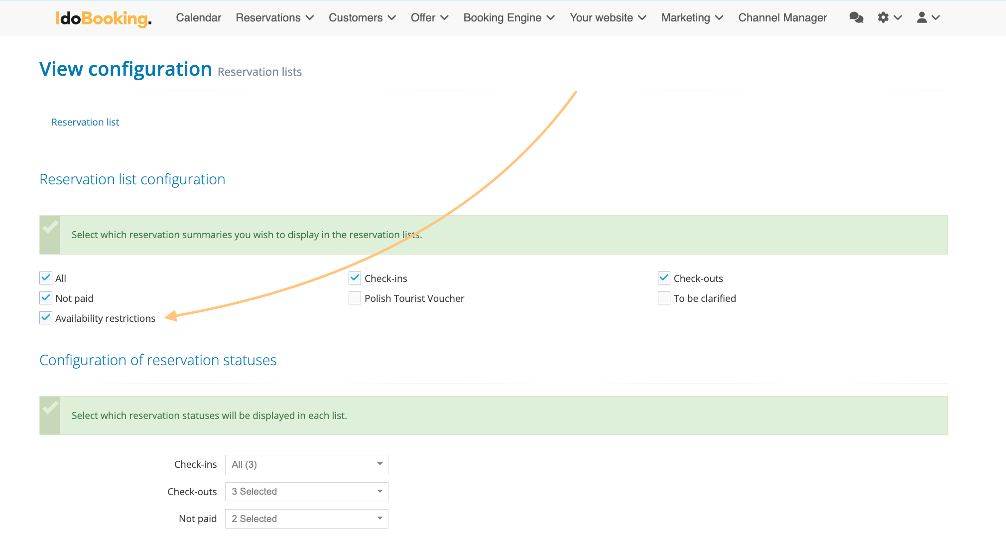 If the Availability Restrictions List is not visible in your panel, simply go to the configuration of the Reservation List view and select the appropriate column. If you want to add a Notes view, mark it in the Column Configuration section.