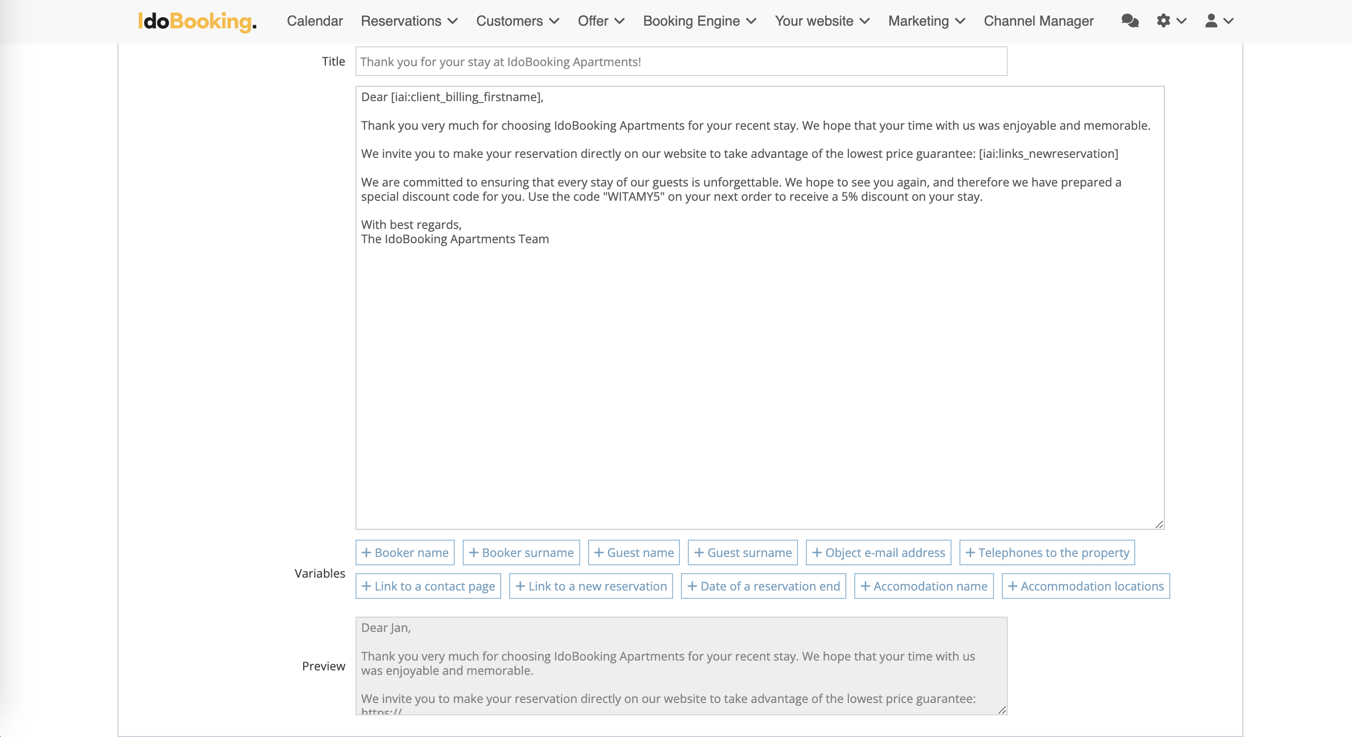 We are pleased to inform you about the new features in Message Templates sent to Bookers. A new template has been added, sent automatically at a selected moment after the booking ends.