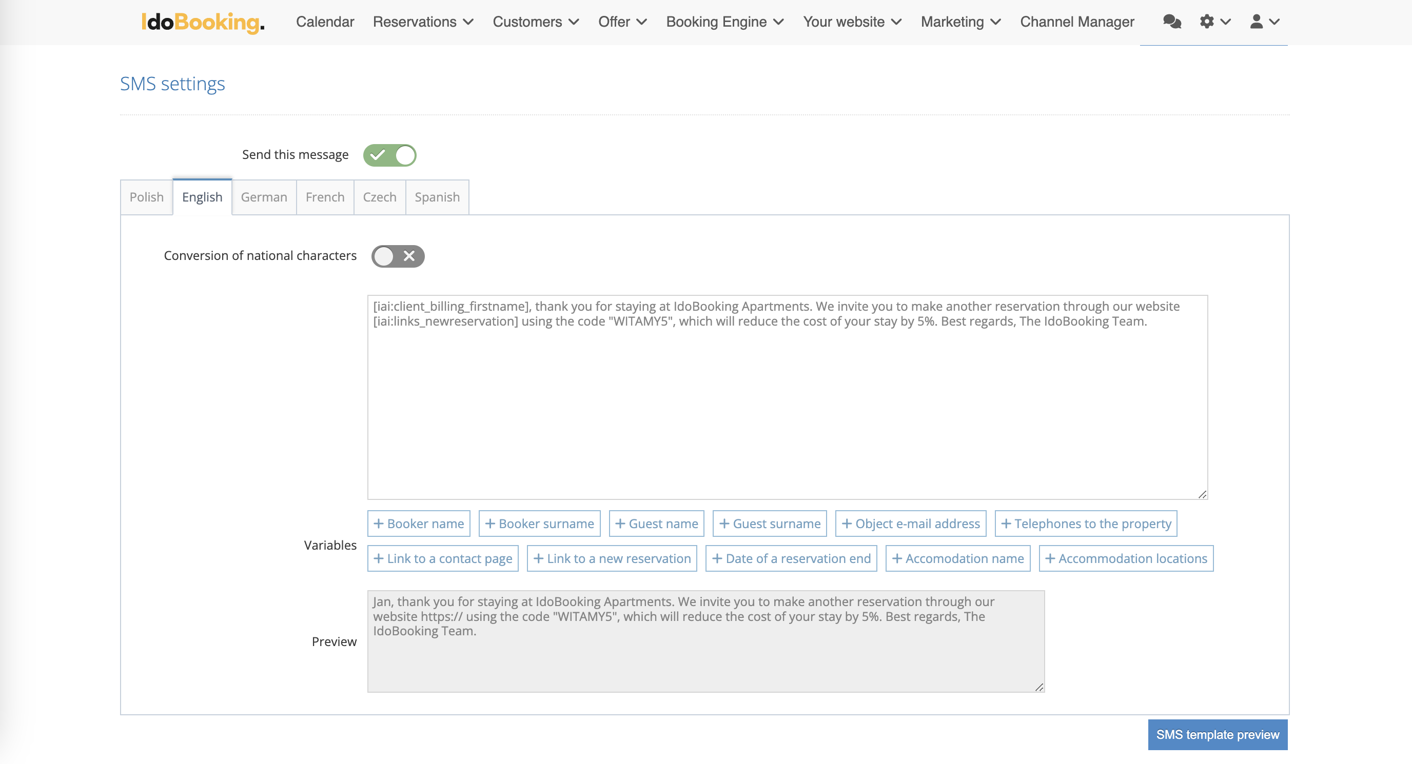 • Messages have different language versions, which allows sending content tailored to the nationality of the Guests