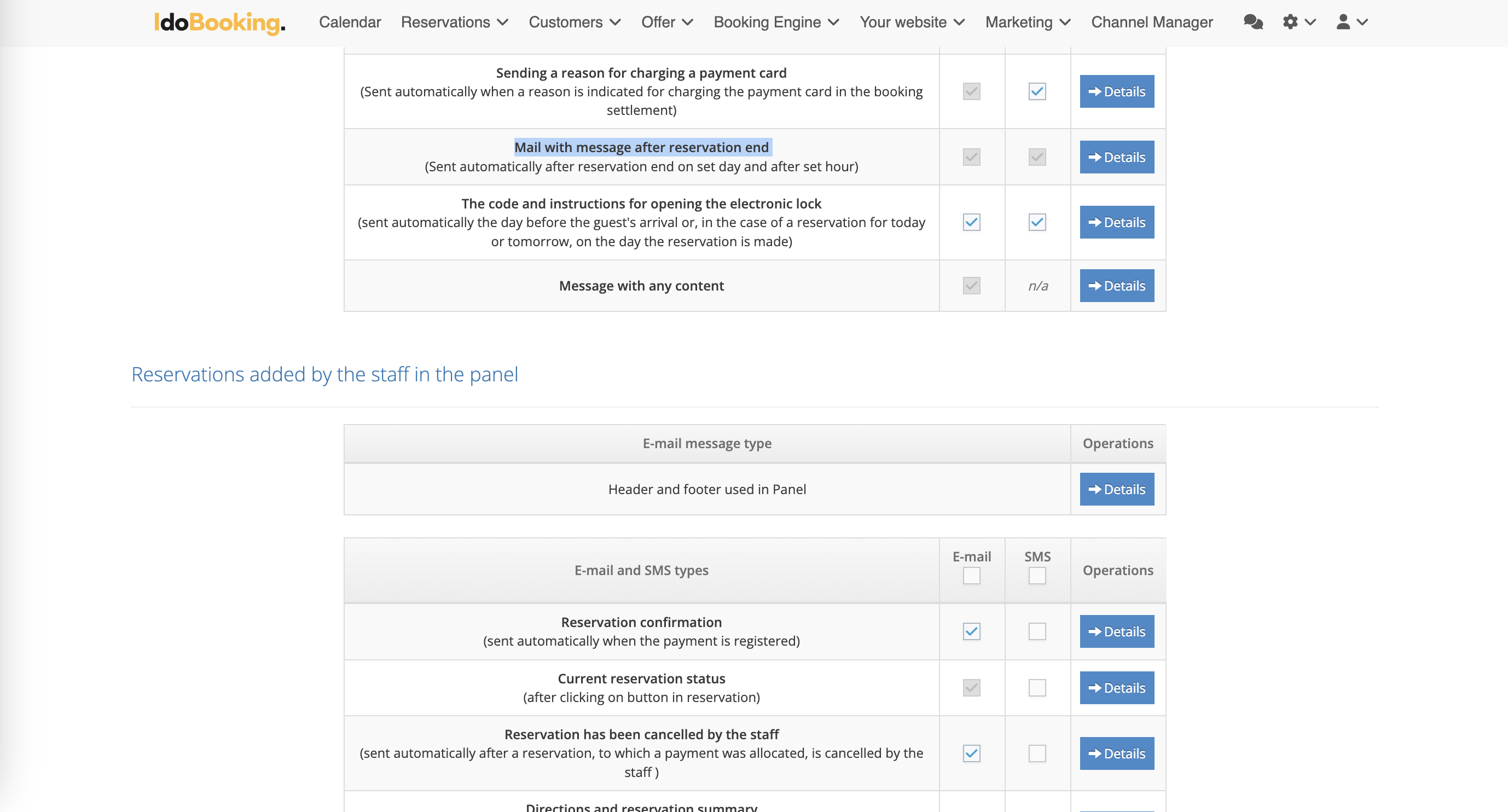 Go to ADMINISTRATION > Templates of sent messages (To the customer). In the list of messages sent to 3 sources — Widget, Panel, and Channel Manager — you will find a new item Mail with message after reservation end. When editing the message, you can: