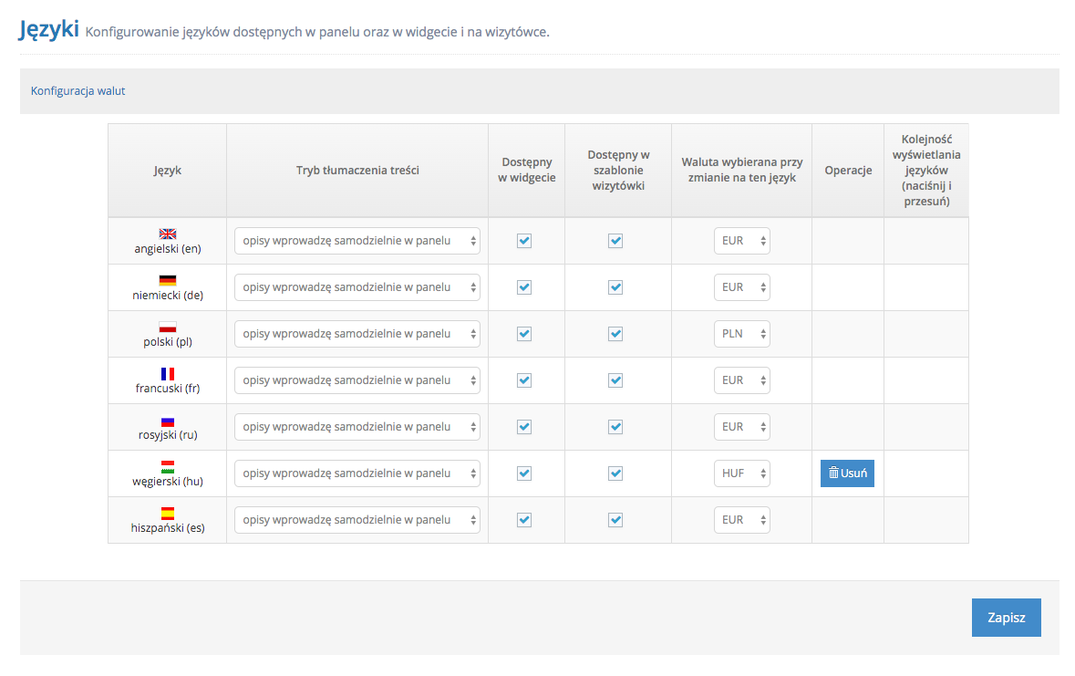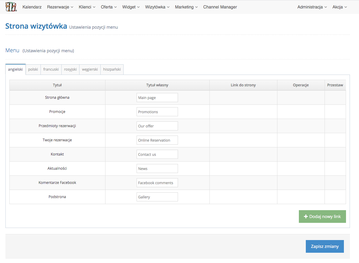 Po zaznaczeniu checkboxa w kolumnie Dostępny w Widgecie i Dostępny w szablonie wizytówki nowo dodany język będzie widoczny w Wizytówce i Booking Engine).