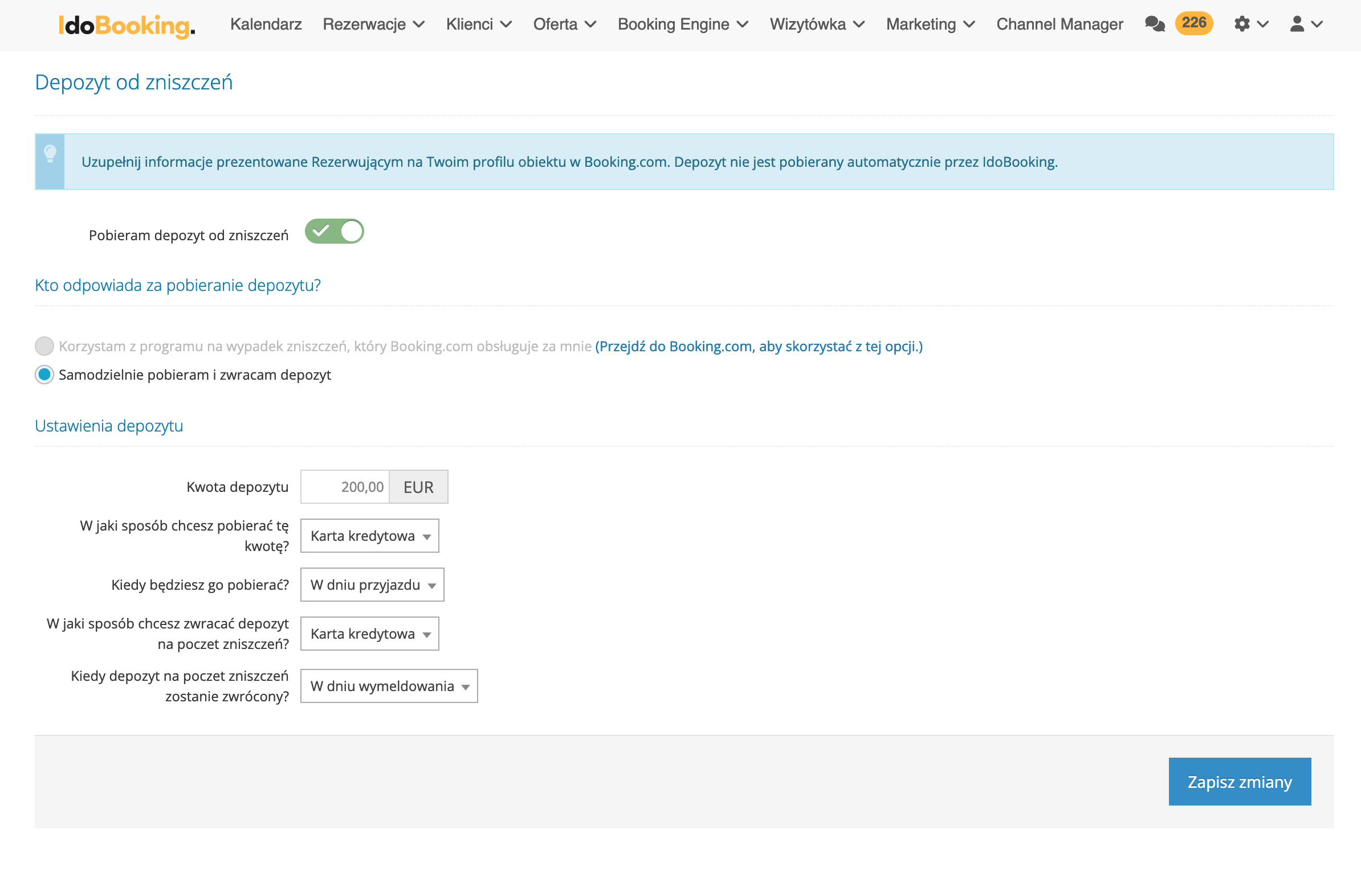 Depozyt od zniszczeń - ustalenie depozytu jako zabezpieczenia przed szkodami umożliwia wcześniejsze pobranie środków na wypadek ewentualnych zniszczeń w twoim obiekcie. Uzupełnij tę informację i poinformuj gości, w jakiej kwocie i w jaki sposób pobierzesz od nich depozyt oraz kiedy mogą się spodziewać zwrotu środków. Do obsługi tego procesu możesz wykorzystać szybkie płatności i zwroty IdoPay.