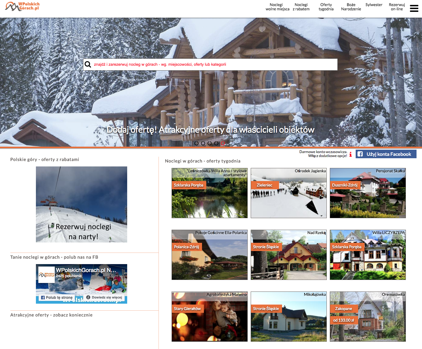 Portal WPolskichGorach.pl należy do grupy PolskiePortale.pl i prezentuje obiekty noclegowe we wszystkich pasmach górskich w Polsce. Portal istnieje od 2013 roku i zyskuje coraz większą popularność, a dzięki dodatkowym działaniom marketingowym prowadzonym poza Internetem umożliwia dotarcie Twojej oferty do szerokiego grona odbiorców.