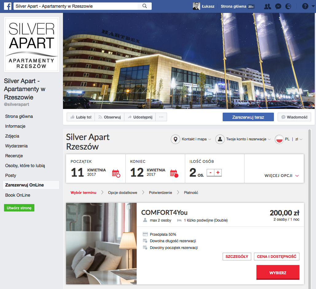 Apartamenty Silver Apart umożliwiają swoim gościom dokonywanie rezerwacji na Facebooku. "W związku z tym iż w głównej mierze pozyskujemy klientów z naturalnych wyników wyszukiwania a pośrednio z serwisów noclegowych nie mieliśmy do tej pory wielu rezerwacji np. z profilu FB. Natomiast monitorujemy to i widzimy po infolinii że zdarzają się zapytania z Facebook-a. Jest to oczywiście kanał który będziemy chcieli usprawnić w bieżącym roku. Głównie dlatego żeby poszukać kanałów w których płacimy mniejszą prowizję za pozyskanie i przekierowanie klienta." - mówi menedżer Apartamenty Silver Apart Pani Iwona